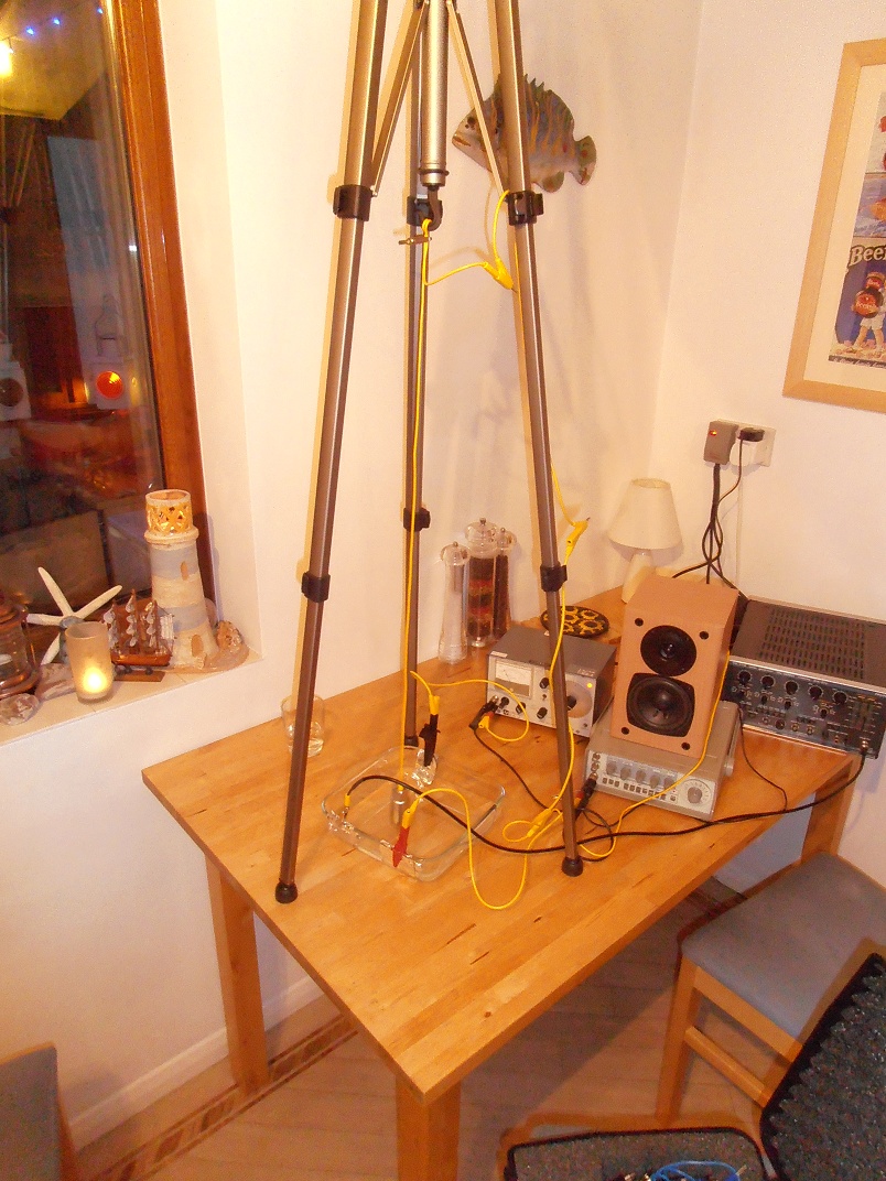 This week’s little delight I’ve called Flux Reversal and felt like a blue one to me. This evolving little number was made with a blend of several layers including three warm gently overdriven tube signal generators, a series of reversed glassy digital hybrid bells and three analog waveforms from old signal generators mixed in a super smooth sequence using a pendulum orbiting in a bath of brine water! The latter setup I call The Water Mixer and often makes bystanders raise their eyebrows when they catch sight of various test leads and old lab equipment hooked up to a baking tray full of salty water!!… Things your mom told you never to do – like sticking a knife in the toaster… which, knowing me, I probably tried as a kid! (you forget such events as an ever tinkering electronic engineer after over 30 years of this kind of thing!)…