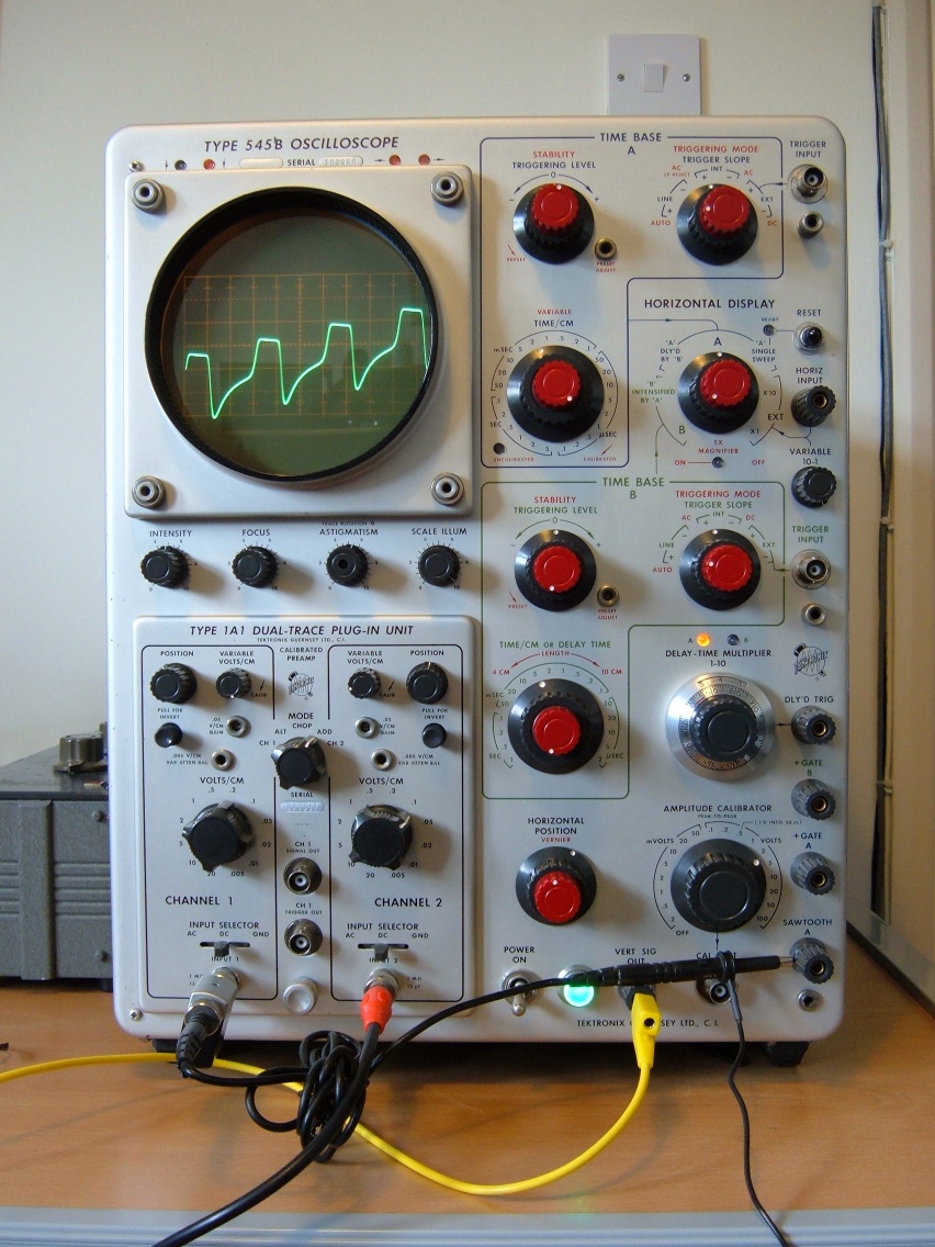 Type 545B Chopper was the result of one of my more experimental sessions. The raw sample data was made in a rather bizarre manner by feeding a basic waveform into channel #1 of a 1968 Tektronix 545B tube scope and setting it up to trigger on it. This resulted in the sawtooth generated by the timebase being in sync with the incoming waveform which was promptly fed back into channel #2 on the scope. The Type 1A1 plug-in unit was then set to chop mode whereby the two input signals were alternately chopped to create a complex waveform syncronised to the external signal. The trigger level was then slowly tweaked resulting in a very unusual signal ending up on the vertical signal output. This was captured and several seconds of sample was programmed up to fire on random round robins with different sample starting points on each. The harmonically rich waveform was then filtered randomly and a simple arpeggiator patch setup to sequence the whole thing.