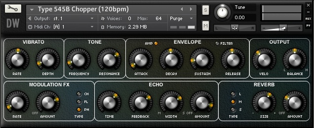 The delay in the default instrument has been configured to run at 120 bpm – this can be tweaked in the GUI to gain the desired effect at any bpm set in Kontakt. It is quite entertaining to hold down some notes and start tweaking the filter cutoff, filter amount and filter decay settings as well as just about everything else on this one!