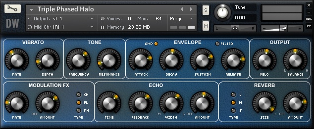 Triple Phased Halo is the latest addition to The Blue Zone Series for Kontakt 4.2.4 and above. It was made with two tube generated bell ratios each created by feeding mixed dual sine waves from a 1960’s tube infested Panoramic Two Tone Generator fed hot into the Minimoog’s external input with the filter running in self oscillation at a fixed ratio. The results were passed into the Triple Tube Hybrid Phaser and a number of loops created in Kontakt…