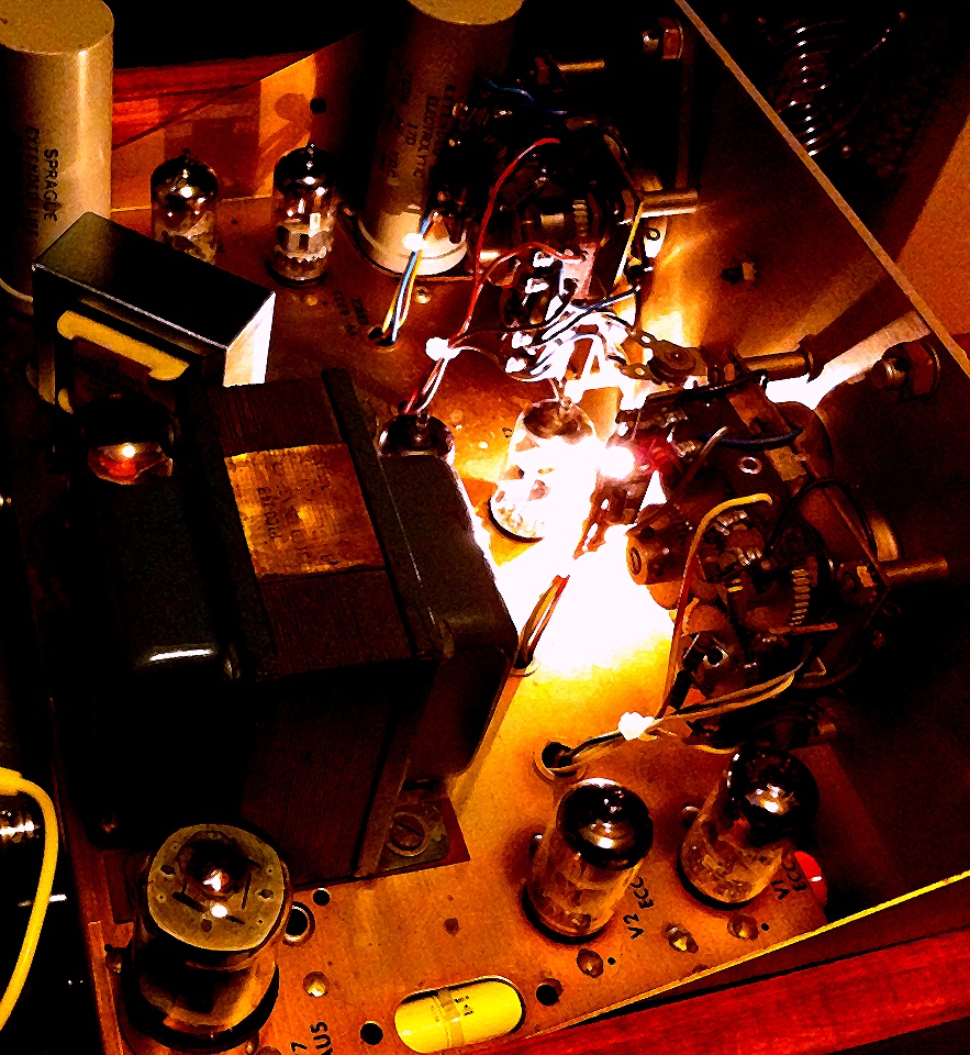 Octave Flipper was made by recording the vertical signal output of a 1968 Tektronix 545B tube oscilloscope with the timebase pushed into instability between single and double cycles on the screen whilst triggered by a cyclic input signal and chopped (multiplexed) with the timebase sawtooth waveform! This caused a harmonically rich octave flipping effect.